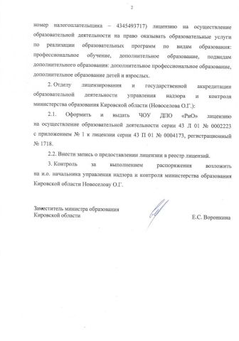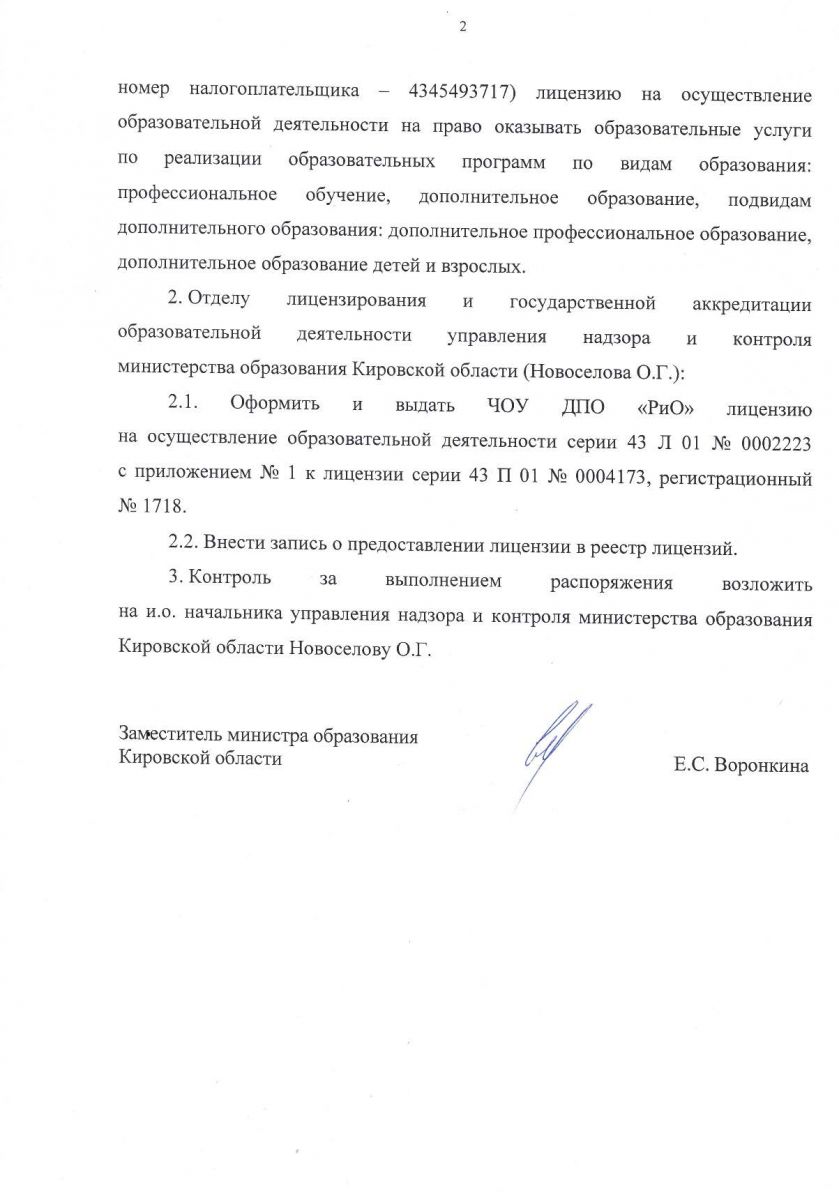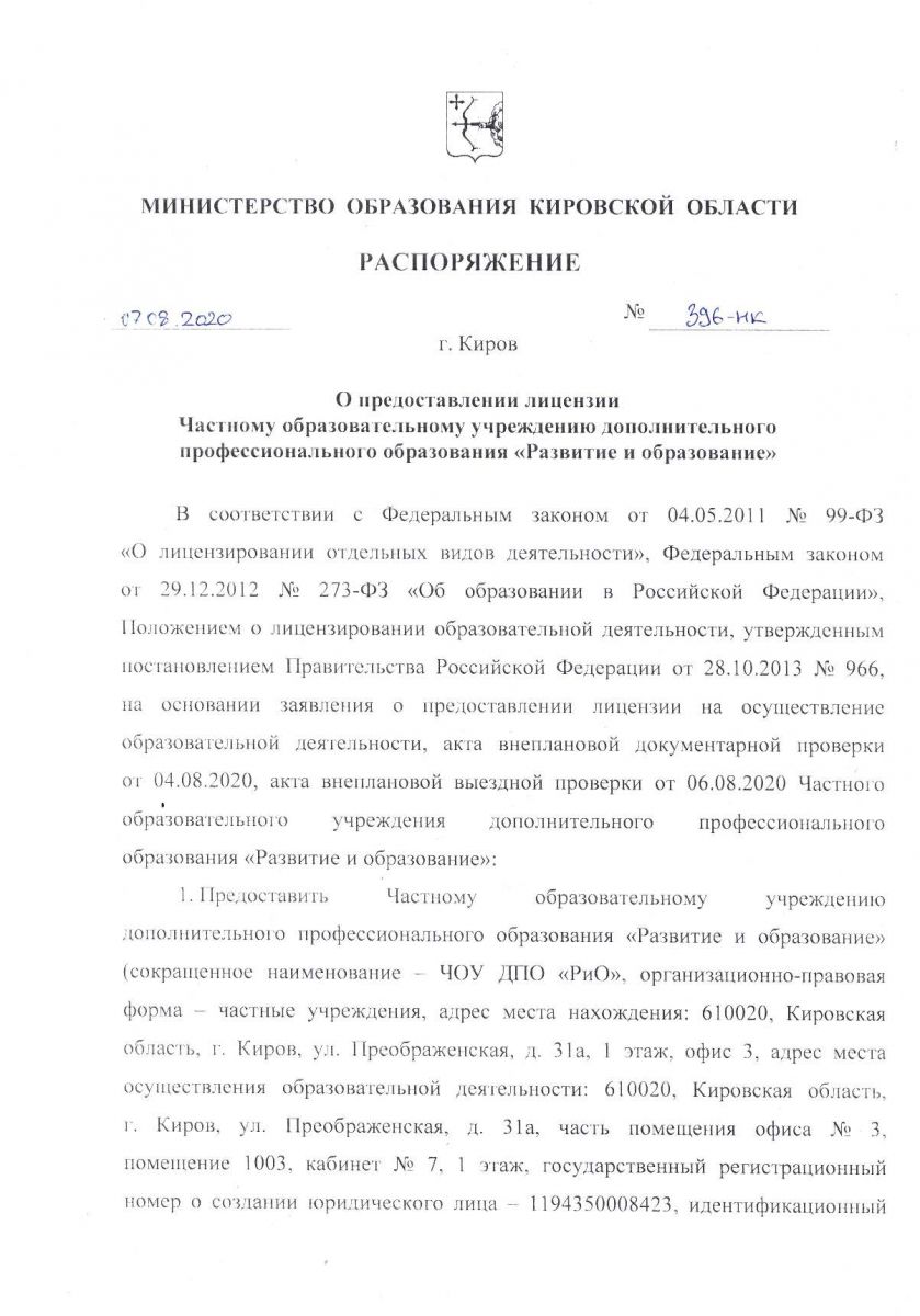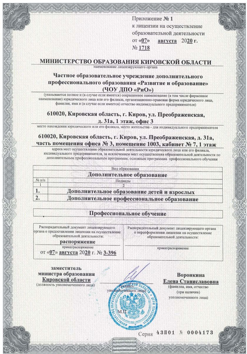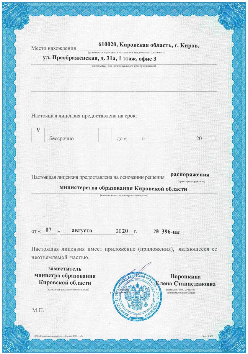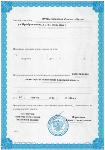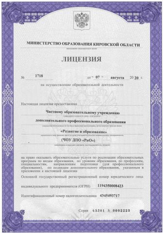 Лицензия на осуществление образовательной деятельности за № 1718 от 07 августа 2020 года выдана Министерством образования Кировской области Лицензия разрешает виды образования: 1. дополнительное образование (подвиды: дополнительное образование детей и взрослых и дополнительное профессиональное образование); 2. профессиональное обучение. Срок действия лицензии: БЕССРОЧНО |